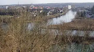 ![]() El río Ager (derecha, fluyendo del oeste) juntándose con el río Traun (en el centro, fluyendo desde el sur) | ||