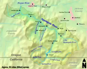 El río Applegate drena unos 1810 km².[4] Aproximadamente el 35 % de la cuenca es de propiedad del Servicio Forestal de los Estados Unidos (como parte del bosque nacional Rogue River-Siskiyou), y otro 35 % del Bureau of Land Management. El 20% es de propiedad privada, mientras que el 10% restante son bosques comerciales.[7]
