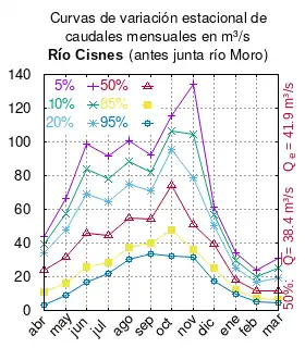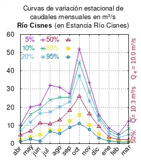 El caudal del río (en un lugar fijo) varía en el tiempo, por lo que existen varias formas de representarlo. Una de ellas son las curvas de variación estacional que, tras largos periodos de mediciones, predicen estadísticamente el caudal mínimo que lleva el río con una probabilidad dada, llamada probabilidad de excedencia. La curva de color rojo ocre (con ) muestra los caudales mensuales con probabilidad de excedencia de un 50%. Esto quiere decir que ese mes se han medido igual cantidad de caudales mayores que caudales menores a esa cantidad. Eso es la mediana (estadística), que se denota Qe, de la serie de caudales de ese mes. La media (estadística) es el promedio matemático de los caudales de ese mes y se denota .