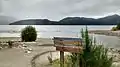 Vista del Lago Correntoso (delante) y el Lago Nahuel Huapi (atrás) desde el Cerro Bayo. En el centro de la imagen se ve el nacimiento del Río Correntoso (y el puente que lo cruza), pudiéndose apreciar su corta longitud.