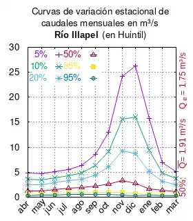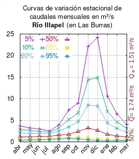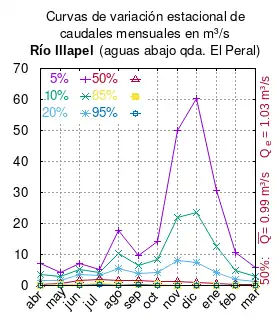El caudal del río (en un lugar fijo) varía en el tiempo, por lo que existen varias formas de representarlo. Una de ellas son las curvas de variación estacional que, tras largos periodos de mediciones, predicen estadísticamente el caudal mínimo que lleva el río con una probabilidad dada, llamada probabilidad de excedencia. La curva de color rojo ocre (con ) muestra los caudales mensuales con probabilidad de excedencia de un 50%. Esto quiere decir que ese mes se han medido igual cantidad de caudales mayores que caudales menores a esa cantidad. Eso es la mediana (estadística), que se denota Qe, de la serie de caudales de ese mes. La media (estadística) es el promedio matemático de los caudales de ese mes y se denota .