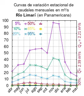 El caudal del río (en un lugar fijo) varía en el tiempo, por lo que existen varias formas de representarlo. Una de ellas son las curvas de variación estacional que, tras largos periodos de mediciones, predicen estadísticamente el caudal mínimo que lleva el río con una probabilidad dada, llamada probabilidad de excedencia. La curva de color rojo ocre (con ) muestra los caudales mensuales con probabilidad de excedencia de un 50%. Esto quiere decir que ese mes se han medido igual cantidad de caudales mayores que caudales menores a esa cantidad. Eso es la mediana (estadística), que se denota Qe, de la serie de caudales de ese mes. La media (estadística) es el promedio matemático de los caudales de ese mes y se denota .