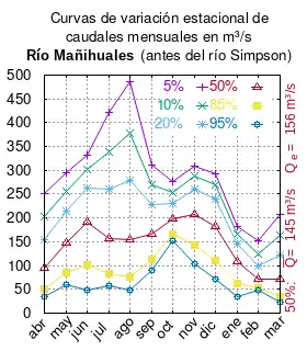 El caudal del río (en un lugar fijo) varía en el tiempo, por lo que existen varias formas de representarlo. Una de ellas son las curvas de variación estacional que, tras largos periodos de mediciones, predicen estadísticamente el caudal mínimo que lleva el río con una probabilidad dada, llamada probabilidad de excedencia. La curva de color rojo ocre (con ) muestra los caudales mensuales con probabilidad de excedencia de un 50 %. Esto quiere decir que ese mes se han medido igual cantidad de caudales mayores que caudales menores a esa cantidad. Eso es la mediana (estadística), que se denota Qe, de la serie de caudales de ese mes. La media (estadística) es el promedio matemático de los caudales de ese mes y se denota .