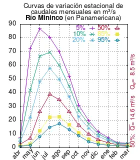 El caudal del río (en un lugar fijo) varía en el tiempo, por lo que existen varias formas de representarlo. Una de ellas son las curvas de variación estacional que, tras largos periodos de mediciones, predicen estadísticamente el caudal mínimo que lleva el río con una probabilidad dada, llamada probabilidad de excedencia. La curva de color rojo ocre (con ) muestra los caudales mensuales con probabilidad de excedencia de un 50%. Esto quiere decir que ese mes se han medido igual cantidad de caudales mayores que caudales menores a esa cantidad. Eso es la mediana (estadística), que se denota Qe, de la serie de caudales de ese mes. La media (estadística) es el promedio matemático de los caudales de ese mes y se denota .