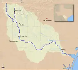 El río discurre primero en dirección sur, atravesando el condado de Hill, pasando por Barksdale y recogiendo las aguas, por la izquierda, de uno de sus principales afluentes, el West Fork. Sigue luego por Crystal City (7190 hab.) y se acerca a poco más de 50 km del río Grande, en la frontera con México. Al este de Carrizo Springs (5655 hab.), el río gira hacia el Este, discurriendo a través de las llanuras de matorral del Sur de Texas, cruzando las zonas rurales de los condados de Dimmit, La Salle y McMullen.