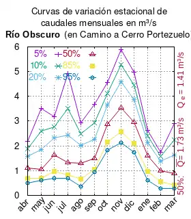 El caudal del río (en un lugar fijo) varía en el tiempo, por lo que existen varias formas de representarlo. Una de ellas son las curvas de variación estacional que, tras largos periodos de mediciones, predicen estadísticamente el caudal mínimo que lleva el río con una probabilidad dada, llamada probabilidad de excedencia. La curva de color rojo ocre (con ) muestra los caudales mensuales con probabilidad de excedencia de un 50%. Esto quiere decir que ese mes se han medido igual cantidad de caudales mayores que caudales menores a esa cantidad. Eso es la mediana (estadística), que se denota Qe, de la serie de caudales de ese mes. La media (estadística) es el promedio matemático de los caudales de ese mes y se denota .