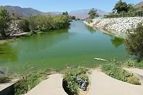 ![]() Poza de aguas detenidas sobre el lecho del río Puangue al extremo sur de la ciudad de Curacavi. La foto es de marzo de 2023 en dirección aguas abajo desde un paso vehicular construido sobre tubos. | ||