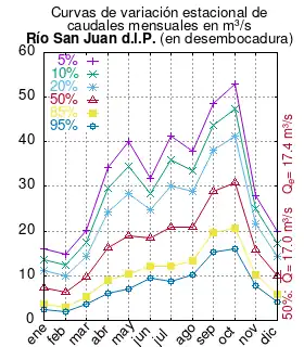 El caudal del río (en un lugar fijo) varía en el tiempo, por lo que existen varias formas de representarlo. Una de ellas son las curvas de variación estacional que, tras largos periodos de mediciones, predicen estadísticamente el caudal mínimo que lleva el río con una probabilidad dada, llamada probabilidad de excedencia. La curva de color rojo ocre (con ) muestra los caudales mensuales con probabilidad de excedencia de un 50%. Esto quiere decir que ese mes se han medido igual cantidad de caudales mayores que caudales menores a esa cantidad. Eso es la mediana (estadística), que se denota Qe, de la serie de caudales de ese mes. La media (estadística) es el promedio matemático de los caudales de ese mes y se denota .