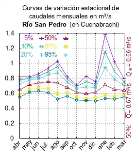 El caudal del río (en un lugar fijo) varía en el tiempo, por lo que existen varias formas de representarlo. Una de ellas son las curvas de variación estacional que, tras largos periodos de mediciones, predicen estadísticamente el caudal mínimo que lleva el río con una probabilidad dada, llamada probabilidad de excedencia. La curva de color rojo ocre (con ) muestra los caudales mensuales con probabilidad de excedencia de un 50%. Esto quiere decir que ese mes se han medido igual cantidad de caudales mayores que caudales menores a esa cantidad. Eso es la mediana (estadística), que se denota Qe, de la serie de caudales de ese mes. La media (estadística) es el promedio matemático de los caudales de ese mes y se denota .