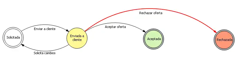 Para especificar estos flujos de trabajo el usuario puede crear diagramas de estados con la misma notación que la utilizada en la teoría de autómatas finitos. En esta notación, un círculo corresponde a un posible estado del documento y una flecha corresponde a una transición o cambio de estado del mismo. En el siguiente ejemplo puede verse un flujo de trabajo correspondiente a un proceso de ofertas comerciales: