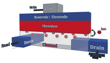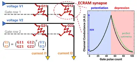 La memoria electroquímica de acceso aleatorio (ECRAM) es un tipo de memoria no volátil (NVM) con celdas multinivel (MLC) diseñada para la aceleración analógica del aprendizaje profundo.[1][2][3] Una celda ECRAM es un dispositivo de tres terminales compuesto por un canal conductor, un electrolito aislante, un depósito iónico y contactos metálicos. La resistencia del canal se modula mediante el intercambio iónico en la interfaz entre el canal y el electrolito al aplicar un campo eléctrico. El proceso de transferencia de carga permite mantener el estado en ausencia de energía y programar varios niveles distintos, lo que diferencia el funcionamiento de la ECRAM del de un transistor de efecto de campo (FET). La operación de escritura es determinista y puede dar lugar a una potenciación y depresión simétricas, lo que hace que las matrices ECRAM resulten atractivas para actuar como pesos sinápticos artificiales en implementaciones físicas de redes neuronales artificiales (RNA). Los retos tecnológicos incluyen el potencial de circuito abierto (OCP) y la compatibilidad de la fundición de semiconductores asociada a los materiales energéticos. Universidades, laboratorios gubernamentales y equipos de investigación de empresas han contribuido al desarrollo de la ECRAM para computación analógica. En particular, Sandia National Laboratories diseñó una célula basada en litio inspirada en materiales de baterías de estado sólido,[4] la Universidad de Stanford construyó una célula orgánica basada en protones,[5] e International Business Machines (IBM) demostró la programación paralela sin selector en memoria para una tarea de regresión logística en una matriz de ECRAM de óxido metálico diseñada para su inserción en el extremo posterior de la línea (Back End Of Line- BEOL).[6] En 2022, investigadores del Instituto Tecnológico de Massachusetts construyeron una tecnología protónica inorgánica compatible con CMOS que lograba características de modulación casi ideales utilizando pulsos rápidos de nanosegundos.[7]
