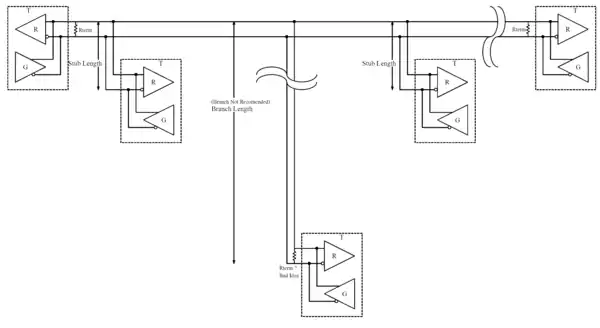Idealmente, los dos extremos del cable tendrán una resistencia de terminación conectada a través de los dos cables. Sin resistencias de terminación, los reflejos de la señal en el extremo no terminado del cable pueden corromper los datos. Las resistencias de terminación también reducen la sensibilidad al ruido eléctrico debido a la menor impedancia. El valor de las resistencias de terminación debe ser igual a la impedancia característica del cable (típicamente, 120 ohmios para pares trenzados). La terminación también incluye resistencias de polarización para establecer una tensión definida para cada cable de datos en el caso de que no esté activado ningún emisor. De esta manera, las líneas estarán polarizadas a voltajes conocidos y los nodos no interpretarán el ruido de las líneas no activas como datos reales; sin resistencias de polarización, las líneas de datos flotan de tal manera que la sensibilidad al ruido eléctrico es mayor cuando todas las estaciones del dispositivo están en silencio o sin alimentación.[3]