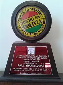Le es otorgado un reconocimiento por parte de la Cámara Departamental de Industria, por su aporte a la Campaña Hecho en Bolivia – Consume lo nuestro, emplea a los nuestros, con la canción “Hecho en Bolivia”.[48]