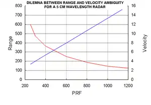 Esta es llamada la velocidad Nyquist. Es inversamente proporcional al tiempo entre pulsos sucesivos: la más pequeña ya está, la más grande será el rango no ambiguo de velocidad. Sin embargo, se sabe que el máximo rango de la reflectividad es inversamente dependiente de :