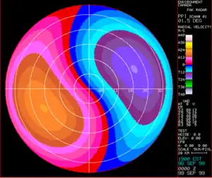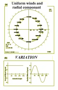 Como el rayo escanea 360° alrededor del radar, los datos vendrán de todos aquellos ángulos y se proyectarán radialmente, como si el viento real viniera desde un ángulo individual. El patrón de intensidad formado por este escaneo será una curva coseno. Uno puede deducir la dirección y la fuerza de la velocidad de las partículas tanto si hay suficiente cobertura de la pantalla de radar.