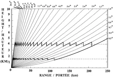 Debido a la curvatura de la Tierra y a cambios del índice de refracción con la altitud, el radar queda “ciego” debajo de una altura dada por el ángulo mínimo o cerrado al radar que su máximo. La imagen muestra la altura de una serie de ángulos típicos en un radar meteo de 5 cm en Canadá; va de 0,3 a 25º.