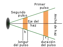 donde es la velocidad de la luz, es la duración del pulso y es el ancho del haz medido en radianes.