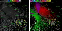 Sin embargo, las gotas de lluvia están cayendo. Como el radar ve solo la componente radial y tiene una cierta elevación del suelo, las velocidades radiales se contaminarán por alguna fracción de la velocidad de caída. Afortunadamente, este componente es insignificante en ángulos de elevación pequeños, pero debe ser tenido en cuenta para ángulos de escaneo más altos.[9]
