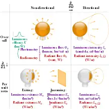 | Radiancia | Le,Ω[7] | vatio por estereorradián por metro cuadrado | W⋅sr−1⋅m−2 | M⋅T−3 | Flujo radiante emitido, reflejado, transmitido o recibido por una superficie, por unidad de ángulo sólido por unidad de área proyectada. Es una cantidad "direccional", a la que a veces también se le llama confusamente "intensidad". |