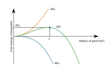 Cuando la variación en la energía libre de Gibbs es positiva, el proceso de nucleación no se llevará a cabo. El radio de la nanopartícula es pequeño, el término superficial prevalece al término de volumen . Contrariamente, si el ritmo de variación es negativo, será estable termodinámicamente. El tamaño de los embriones supera el radio crítico. En este caso, el término del volumen supera al término superficial .