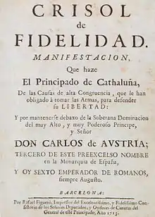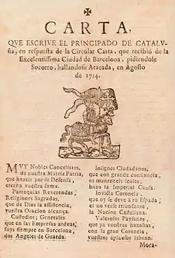 En 1714 la radicalización política catalana acentuó unos planteamientos que Josep Fontana considera "netamente republicanos.[23] El opúsculo Lealthad Catalana, publicado ese año, sostenía que a la Nación solo la representan las cortes, solas, como reunión de los tres brazos, sin la necesaria presencia del rey: «Sólas las resoluciones que se toman en cortes de un reyno o provincia son las que se atribuyena la nación [...], que sólo se representa en sus braços uni dos. Toda la Nación cathalana, junta en sus braços, resolvió el defenderse por el rey en cuyo dominio estava...», añadiendo que no solo por la libertad de «Cathaluña pelea Barcelona, pero aun por la de la Corona de Aragon (...) pero aun toda España», defendiéndose de las acusaciones de rebeldía, justificando la defensa de sus privilegios y resaltando la heroicidad de la lucha de «la Provincia» contra «dos Poderosos, y Capitales Enemigos, como son Francia y Castilla (...) los que más han contribuido para tiranizarla y hacerla esclava».