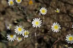 Tiene capítulos con elegantes pétalos de flores blancas. Las lígulas de las flores tienen ráfagas de color lavanda o rosa en la parte inferior, una característica notable cuando las cabezas están cerradas. Cada fruto tiene un vilano de pelos rígidos de color marrón claro o blanco.