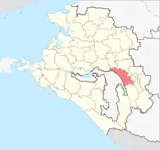 El raión está dividido en un municipio urbano y nueve municipios de tipo rural, que engloban 32 localidades: