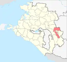 El raión se divide en un municipio urbano y ocho municipios rurales, que engloban a 53 localidades.