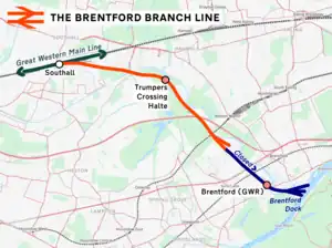 A pesar de la oposición de los propietarios del canal, la Compañía del Ferrocarril Great Western & Brentford se constituyó el 14 de agosto de 1855 mediante una Ley del Parlamento promovida por el GWR. La construcción de la línea y el muelle en Brentford comenzó el 3 de marzo de 1856, con Isambard Kingdom Brunel como ingeniero jefe.[3][4] La vía se construyó como una conexión en Southall (en sentido saliente desde Londres) con la Línea Principal del GWR en el gran ancho de vía de 7 pies 1⁄4 pulgadas (2140 mm) ideado por Brunel. Sin embargo, tardó tres años en completarse debido a la necesidad de construir un puente de tres niveles en Windmill Lane, Southall, donde la línea pasaba por debajo de la carretera y del canal Grand Junction. Como Brunel subestimó el costo de construcción del muelle, fue necesario recaudar capital adicional en virtud de dos leyes más del Parlamento aprobadas en 1857 y 1859.[5]