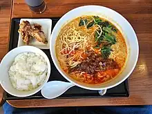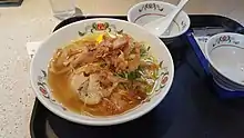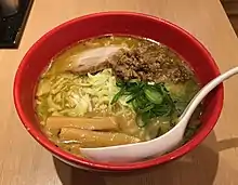El ramen (ラーメン?) (pronunciado aproximadamente r`a:mEn, o ['ɽaːmɛɴ]) es un plato de fideos japonés heredado de la cocina china. Hasta 1951, en Japón el ramen se llamaba shina soba (支那 そば, literalmente ‘soba chino’). Hoy en día, se utiliza chūka soba (中華 そば, que también significa ‘soba chino’) o simplemente ramen, que es uno de los términos más populares. Si bien cada región de Japón tiene su propia receta de ramen, la preparación básica consiste en distintos tipos de fideos japoneses servidos en un caldo preparado comúnmente a base de hueso de cerdo o pollo y distintas verduras, sus sabores varían entre la pasta de miso, salsa de soya (shoyu) o sal (shio), contiene diferentes guarniciones como rebanadas de carne de cerdo (チャーシュ chāshu), nori (海苔 , algas marinas), menma (メンマ) y cebolleta (negi - 葱 cōng).[1][2][3]