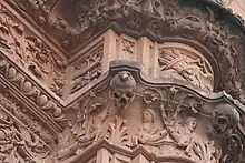 El portal de la Universidad se divide en tres cuerpos horizontales.[2] En orden ascendente el inferior está dedicado a los Reyes Católicos (representados en un medallón central), el segundo al emperador Carlos V y el tercero al Paraíso. En la gran pilastra de la derecha (mirando a la fachada), y en la terminación del primer cuerpo, se encuentran a modo de capitel labradas tres calaveras. Siendo la de la izquierda la que porta encima una rana de pequeño tamaño.[7]