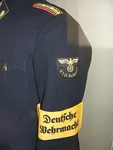 Insignia de rango para un funcionario ferroviario en grado 9a/9, sirviendo en la Wehrmachts-'Verkersdirektion Brüssel (Bélgica ocupada). El brazalete amarillo lo denota como un combatiente de acuerdo con la ley de guerra.
