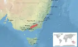 Es originaria de Australia. Vive cerca del Gran Cordillera Divisoria en Victoria y Nueva Gales del Sur. Vive entre 200 y 1100 metros sobre el nivel del mar.[2][3]