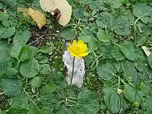 Hierba vivaz , peluda, muy baja o baja. Las hojas todas basales, pegadas al suelo formando una roseta, con forma ovada, dentadas pero no lobuladas, crenada por el borde, con algo de pelo en el envés. En la época de floración emite pedúnculos, sin hojas y con una flor de pétalos amarillos de 18-26 mm, con fragancia de violeta; 5-12 pétalos. Cuando los pétalos caen, queda madura una cabecilla de frutillos (aquenios) de algo más de 1 mm de largos, oblongos y terminados en un diminuto pico ligeramente curvo-ganchudo.[1]