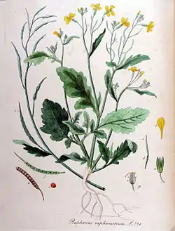 Raphanus es un género de la familia Brassicaceae de plantas de flores. Tiene 126 especies y taxones infraespecíficos descritos, de los cuales una centena son sinónimos, 20 pendientes de resolución taxonómica y solo 8 aceptados (4 especies y 4 taxones infraespecíficos).[2] Incluye el rábano cultivado y el rábano salvaje.