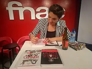 ![]() Raquel Riba Rossy presentando su novela gráfica "Lola Vendetta y los hombres" en el Fnac Callao, en Madrid, el 11 de abril de 2019. | ||