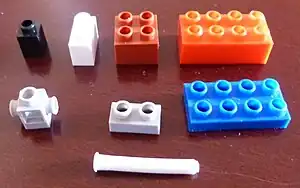 El bloque básico principal tiene 2x4 encastres; a partir de allí, surgen por división o duplicación de sus medidas otros bloques —por ejemplo 2x2, 1x2, 1x4, 1x1, y en mitad de altura las tiras de 2x8, 2x16 y 2x24—, además de una larga serie de accesorios que permiten el armado de juguetes con mayor grado de realismo y detalle —como cadenas, ejes, engranajes, ganchos, hélices, orugas, puertas, rejas, ruedas, tejas, ventanas—.