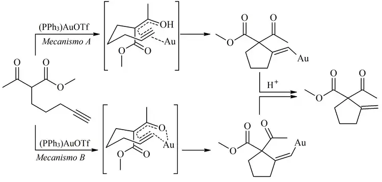 Sin embargo, la necesidad de altas temperaturas limita severamente la utilidad sintética de la reacción de Conia-Ene. Una versión catalítica que se desarrolla a temperatura ambiente y en condiciones neutras aumentaría drásticamente la utilidad de la reacción. En 2004, Toste informó una versión catalizada con oro de fosfina (I) para la adición intramolecular de un β-cetoéster a un alquino inactivado. Para esta reacción, se han desarrollado dos hipótesis mecanicistas.[3]