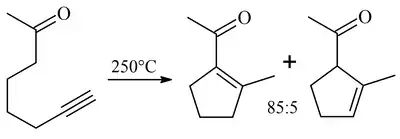 Para sustratos acetilénicos, la migración de doble enlace a menudo ocurre para favorecer un mayor grado de sustitución. No se observa dicha migración cuando un grupo metilo terminal estabiliza el enlace doble exo, o si la reacción se lleva a cabo a temperaturas más bajas, por ejemplo con una β-dicetona como sustrato.