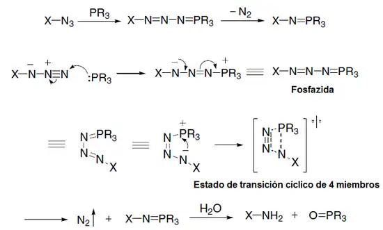 La trialquilfosfina ataca el nitrógeno terminal de la azida, formándose así una fosforazida, la cual forma un estado de transición cíclico de 4 miembros. Éste se descompone en nitrógeno gaseoso y un iminofosforano, el cual se hidroliza para formar la amina y el óxido de trifenilfosfina.