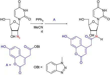La ligación de Staudinger tiene aplicaciones en síntesis de derivados de biomoléculas. Un ejemplo es la creación de un enlace entre un nucleósido y un marcador fluorescente:[6][7]
