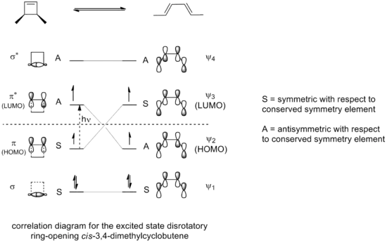 Si la apertura del anillo de 3,4-dimetilciclobuteno fuera llevada a cabo bajo condiciones fotoquímicas, la electrociclización resultante sucedería vía un modo de disociación en vez de un modo conrotatorio, como puede verse por el diagrama de correlación para el las reacciones permitidas de apertura de anillo del estado excitado.
