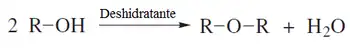 La deshidratación de alcoholes para formar éteres simétricos puede llevarse a cabo con un ácido que funcione como deshidratante, tal como el ácido sulfúrico.[10] El mecanismo de reacción consiste en: