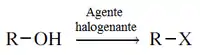 - b)Cloraciones (X = Cl): Se pueden obtener cloruros de alquilo por la acción de varios reactivos,[5] tales como ácido clorhídrico (HCl) para alcoholes terciarios y en presencia de cloruro de zinc para alcoholes secundarios y primarios; cloruro de tionilo,[6] cloruro fosfórico (PCl3) cloruro fosforoso (PCl3) y cloruro de fosforilo.[7] El ácido tricloroisocianúrico (1,3,5-triclorohexahidrotriazin-2,4,6-triona) y trifenilfosfina convierten alcoholes primarios en cloruros de alquilo primarios. También se puede reemplazar el grupo hidroxilo por un halógeno en la Reacción de Appel.