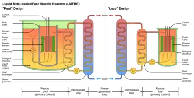 - Tipo Loop, en el que el refrigerante primario circula a través de intercambiadores de calor primario externos al tanque del reactor (pero dentro del escudo biológico) debido a la presencia de sodio-24 radiactivo en el refrigerante primario.