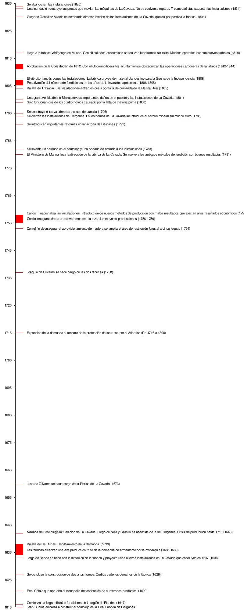 - Estos dos primeros altos hornos supusieron un importante cambio en la tecnología de fundición de metales en España, ya que introdujeron en el reino un sistema de fundición mucho más sofisticado que el de las ferrerías que se aplicaba hasta entonces. Cronológicamente la construcción de hornos altos en España sería Liérganes (1620) La Cavada (1635), Sargadelos (1794), Trubia (1797), Marbella (1822), Sabero (1845).
