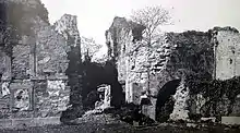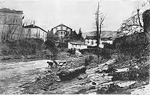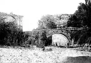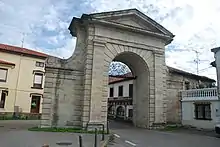 ![]() Arco de acceso a la Real Fábrica en 1890, cuando esta ya se hallaba abandonada. | ||