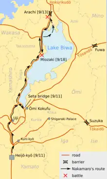 La ex emperatriz despojó a Nakamaro de rango, posición y apellido (11.º día del 9.º mes).[33] Para evitar su vuelo hacia el este, ella tenía las tres barreras antiguas en Suzuka, Fuwa (cerca de lo que luego sería Sekigahara-juku) y Arachi cerró. Estos marcaron la frontera con las provincias orientales. El ejército que ella levantó, ocupó el cuartel general provincial (kokufu) en Ōmi e hizo quemar el puente Seta, por lo que Nakamaro tuvo que encontrar otra ruta de escape. Fujiwara no Kurajimaro fue enviado como líder de un ejército contra Nakamaro.[33]