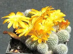 Es una planta perenne carnosa, globosa de color verde armada de espinos y con las flores de color rojo y amarillo.