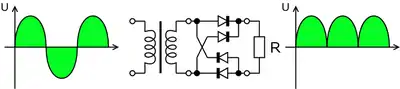 Un rectificador de onda completa convierte la totalidad de la forma de onda de entrada en una polaridad constante (positiva o negativa) en la salida, mediante la inversión de las porciones (semiciclos) negativas (o positivas) de la forma de onda de entrada. Las porciones positivas (o negativas) se combinan con las inversas de las negativas (positivas) para producir una forma de onda parcialmente positiva (negativa).
